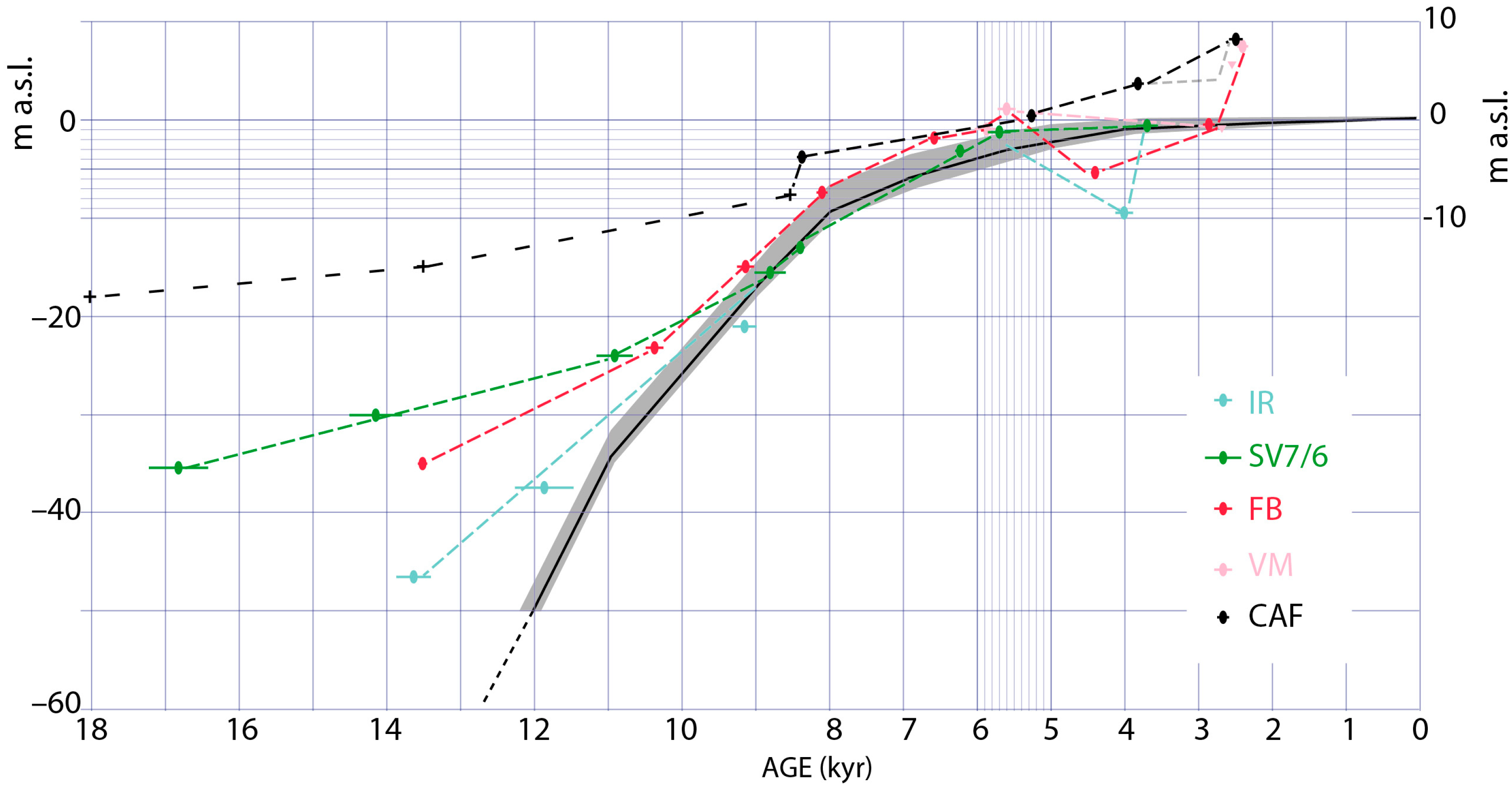 - Vacchi, M.; Marriner, N.; Morhange, C.; Spada, G.; Fontana, A.; Rovere, A. Multiproxy assessment of Holocene relative sea-level changes in the western Mediterranean: Sea-level variability and improvements in the definition of the isostatic signal. Earth-Sci. Rev. 2016, 155, 172–197. [Google Scholar] [CrossRef]