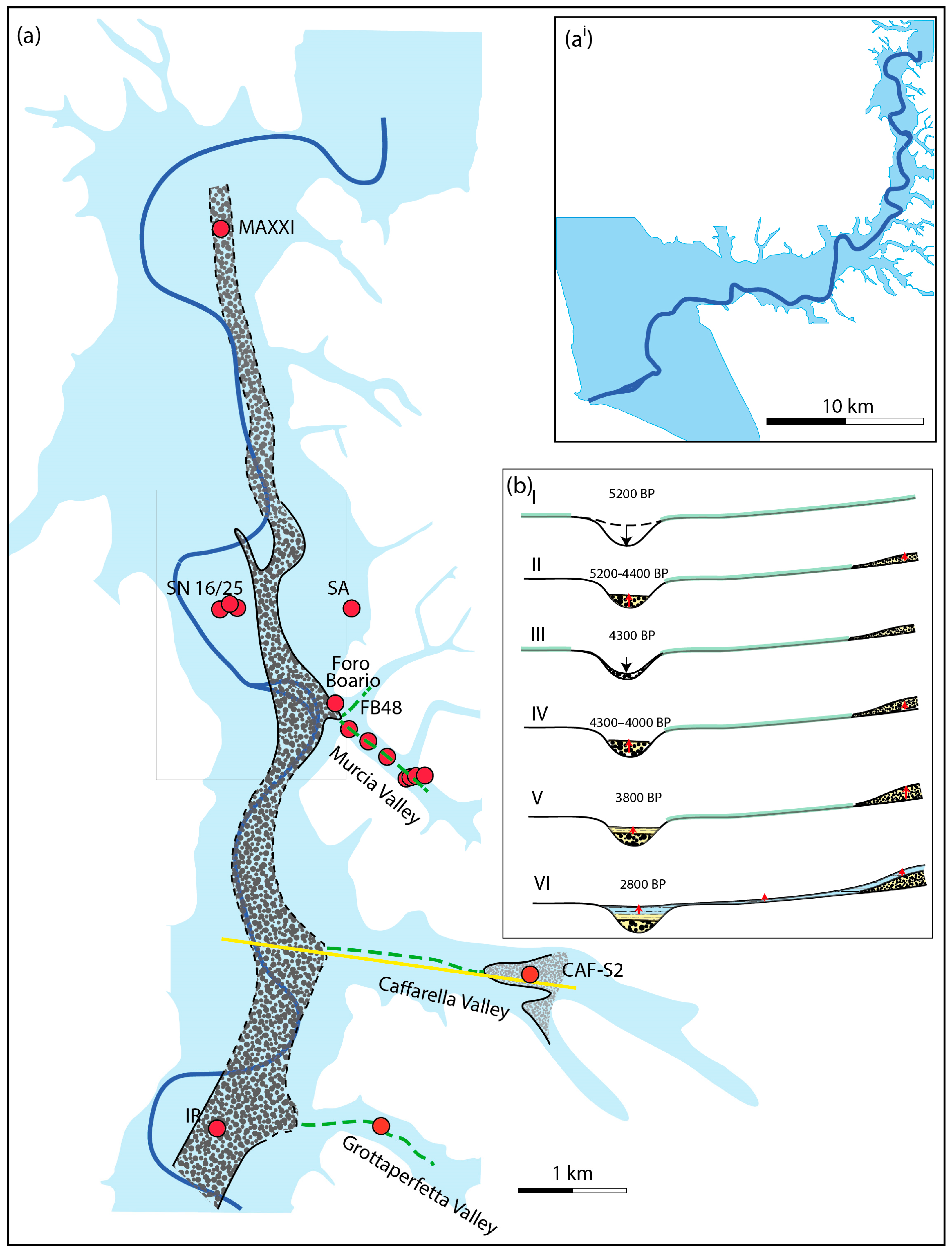 - Marra, F.; Buonfiglio, M.; Motta, L. Holocene aggradation history of the Murcia alluvial valley: Insights on early Rome paleoenvironmental evolution. Quat. Int. 2022, 628, 44–54. [Google Scholar] [CrossRef]