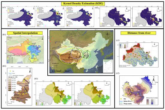 ArcGIS-based spatial analyses illustrating plant dispersal and environmental relationships across different regions of China. Analytical methods include kernel density estimation (KDE), inverse distance weighting (IDW) interpolation, and proximity (distance-from-river) analysis. Maps (a1,b1) are adapted from [27]; (c2) is adapted from [37]; (b2) is adapted from [39]; and (a2,b3,c1) are adapted from [42].