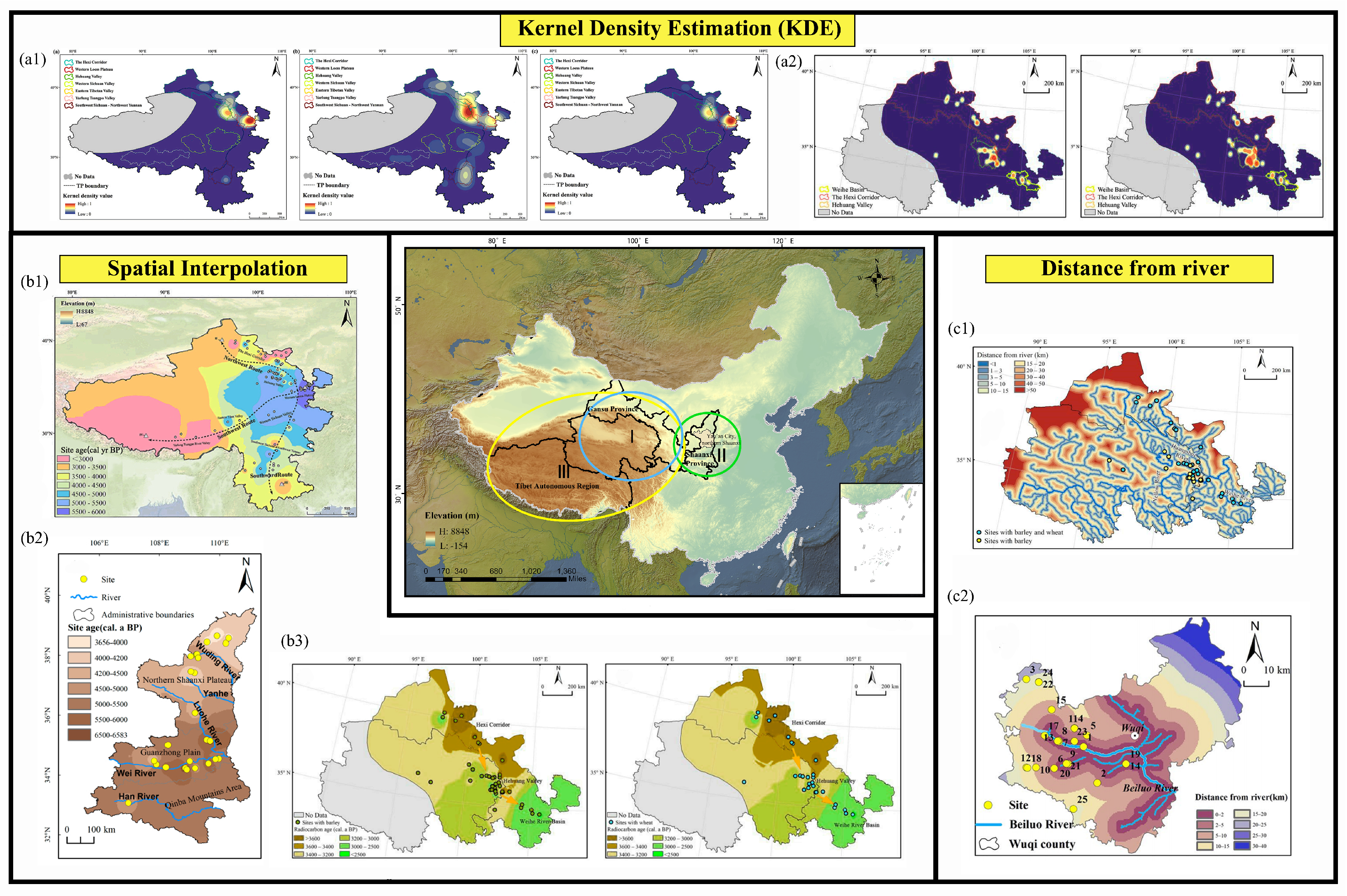 Figure 1. ArcGIS-based spatial analyses illustrating plant dispersal and environmental relationships across different regions of China. Analytical methods include kernel density estimation (KDE), inverse distance weighting (IDW) interpolation, and proximity (distance-from-river) analysis. Maps (a1,b1) are adapted from [27]; (c2) is adapted from [37]; (b2) is adapted from [39]; and (a2,b3,c1) are adapted from [42].