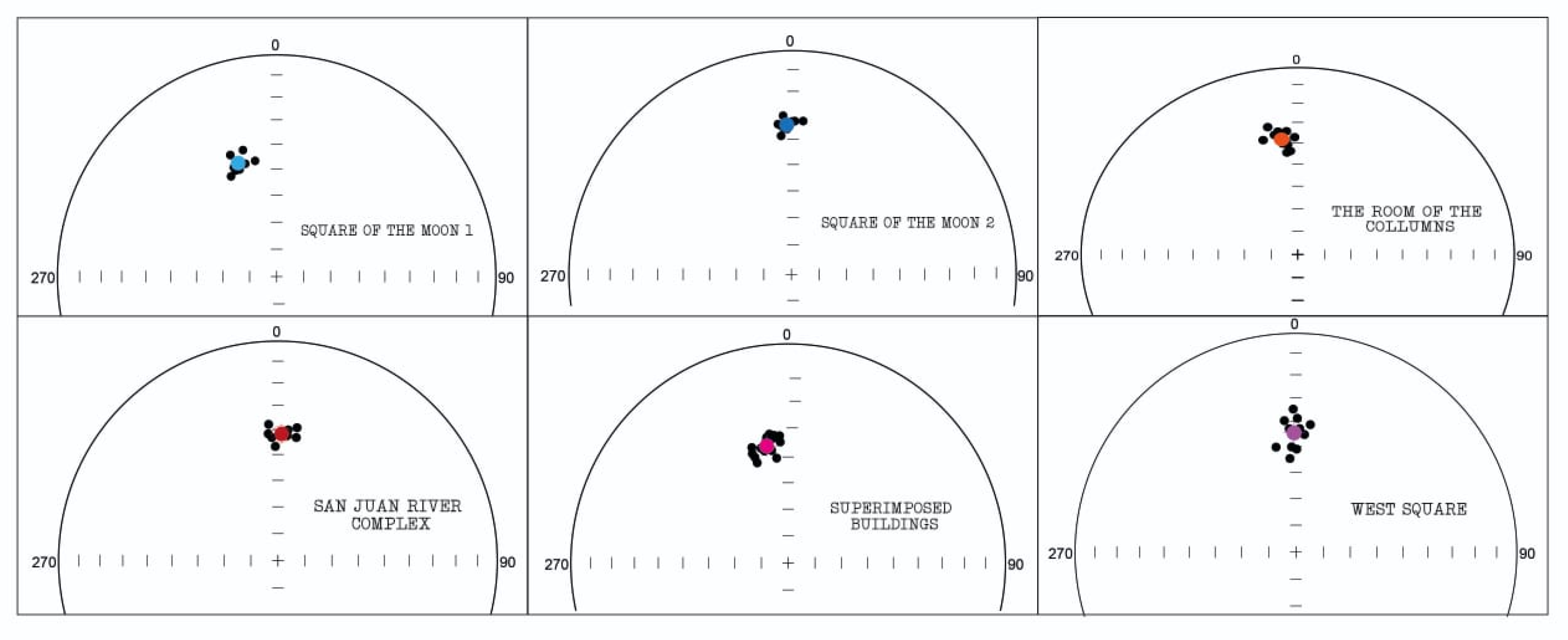 - Of the 64 samples subjected to paleointensity analysis, 34 produced acceptable absolute archaeointensity determinations based on widely accepted quality criteria. Rejected samples exhibited concave-up behavior or evidence of two-slope segments in Arai–Nagata plots. Accepted site/structure mean absolute intensities ranged from 52.5 ± 5.4 µT to 39.4 ± 3.4 µT.