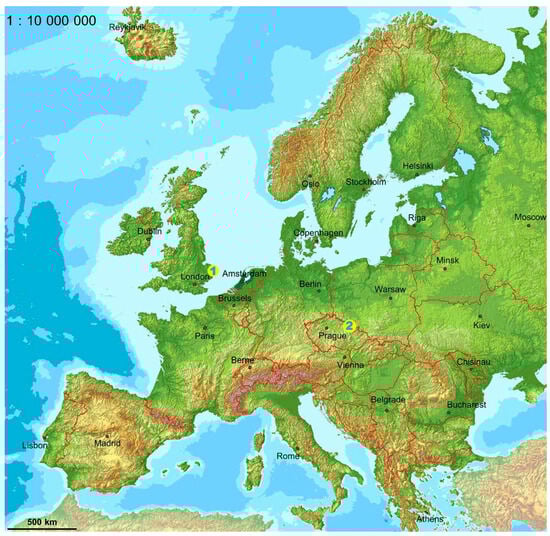 Location of sites which yielded the analyzed Panthera gombaszoegensis remains: 1—Corton, 2—Rogóżka Cave. Scale bar 500 km.