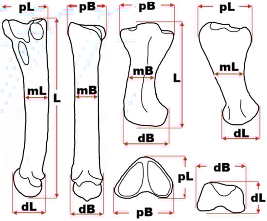 Scheme of measurements of Panthera gombaszoegensis bones: L—total length, pL—proximal epiphysis length, pB—proximal epiphysis breadth, mL—middle shaft length, mB—middle shaft breadth, dL—distal epiphysis length, dB—distal epiphysis breadth.