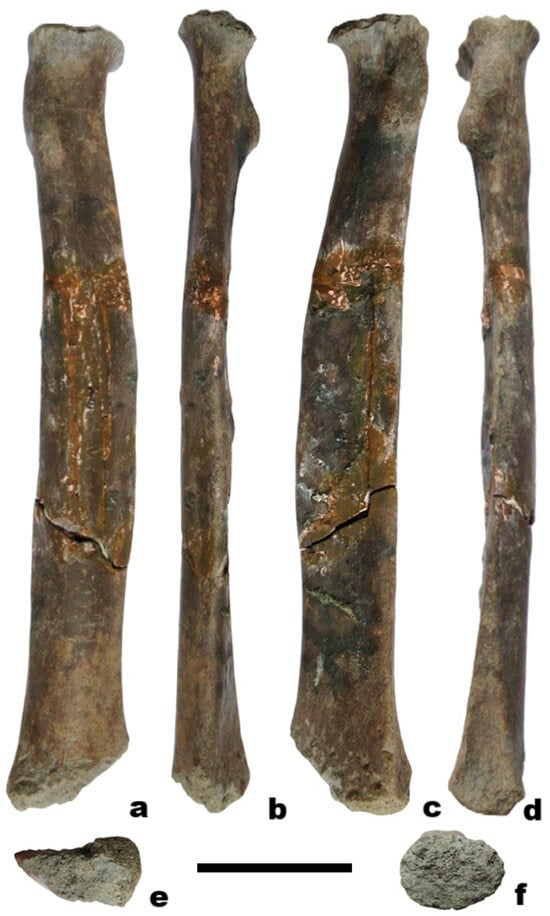 Right radius (MS 22) of Panthera gombaszoegensis from Corton: (a)—lateral view, (b)—cranial view, (c)—medial view, (d)—caudal view, (e)—proximal view, (f)—distal view. Scale bar 40 mm.