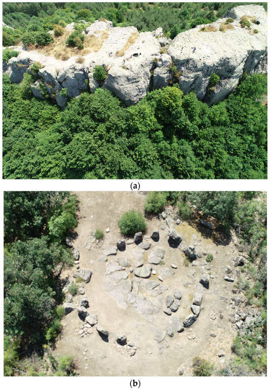 (a,b) General view of the rock-cut monument “Belintash” near the village of Mostovo (a) and the cromlech near the village of Dolni Glavanak, Madzharovo Municipality (b).
