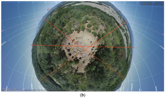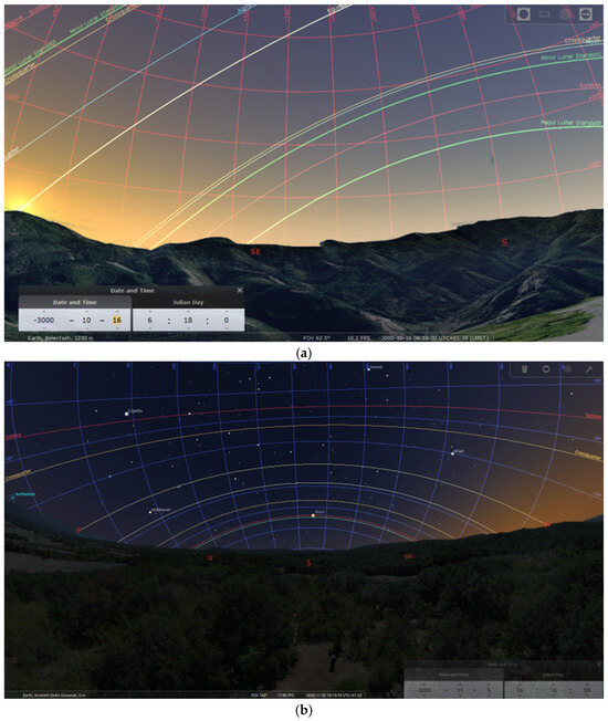 This is followed by a procedure for embedding the 3D model in the specialized astronomical software Stellarium, which provides virtual access for astronomical observations from specific points on the territory of the studied monuments during their existence (Figure 5a,b).