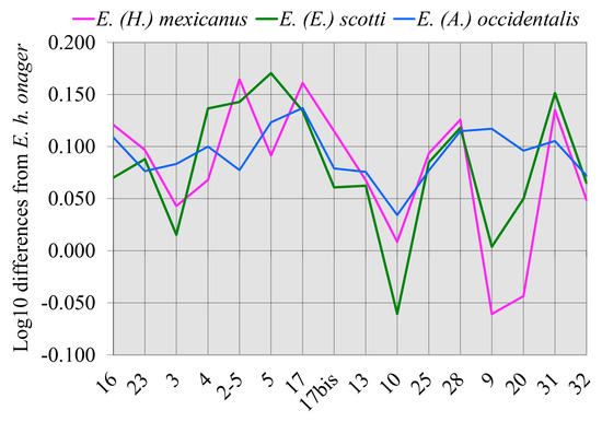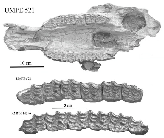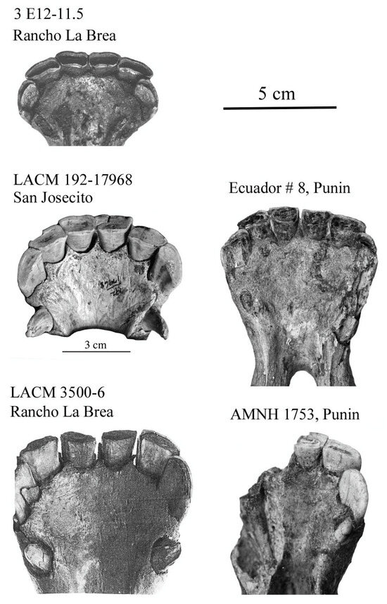 - A partial cranium from Oaxaca State, Mexico, referred to E. mexicanus (UMPE 521) by ([23], Figure 4-A) has basicranial proportions that are different from the holotype of E. (H.) mexicanus (Supplementary Files S8 and S9). In fact, UMPE 521 (Figure 46) is similar to specimens of E. (A.) occidentalis (Supplementary File S42) and its cheek teeth also show the morphology observed in this species (Figure 46); UMPE 521 may be referred to E. (A.) occidentalis.