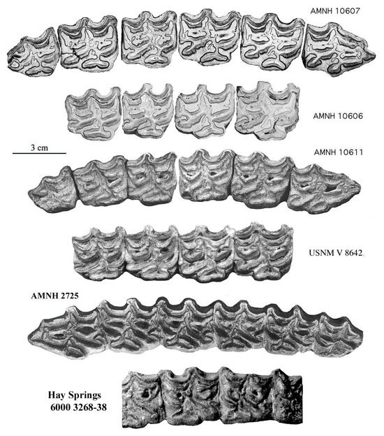 - Leidy, J. Description of vertebrate fossils. In Post-Pliocene Fossils of South-Carolina; Holmes, F.S., Ed.; Russell & Jones: Charleston, WV, USA, 1860; pp. 99–122. Available online: https://www.biodiversitylibrary.org/page/12524898 (accessed on 10 November 2024).