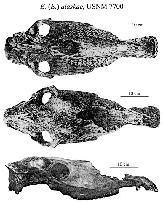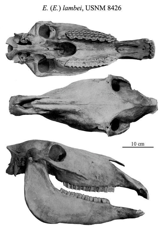 - Equus (E.) alaskae Hay, 1913b, type: cranium of a young male, USNM 7700 (Figure 17), from Sullivan’s Creek, Tofty, Central Alaska, described as E. niobrarensis alaskae [45]. The muzzle is rather long relative to the palate (Supplementary File S18).