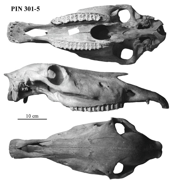 - Eisenmann ([11,42], Figure 60 in [11]) referred to E. (E.) scotti a very well-preserved skull (Supplementary Table S1) collected at Ulakhan Bet Sular, along the Adycha River (affluent of the Iana, northern Siberia). It is preserved at the Severtsov Institute of Moscow as N° 160-455 (ex “Bet 55”). Size, proportions, and location of the posterior palatine foramen are very close to E. (E.) scotti, but the frontal region is flat instead of bulging. Both Franck’s and Palatal indices are caballine. The upper cheek teeth also resemble those of E. (E.) scotti; the lowers are not known. According to Sher (personal communication), it comes from magneto-positive deposits probably inside the lower Brunhes. Many large metapodials collected by Sher at Chukochya and Adycha may also be referred to E. (E.) scotti.