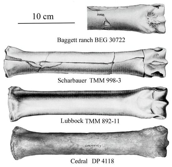 - Hay, O.P. Descriptions of some Pleistocene vertebrates found in the United States. Proc. U. S. Natl. Mus. 1920, 58, 1–74. [Google Scholar] [CrossRef]