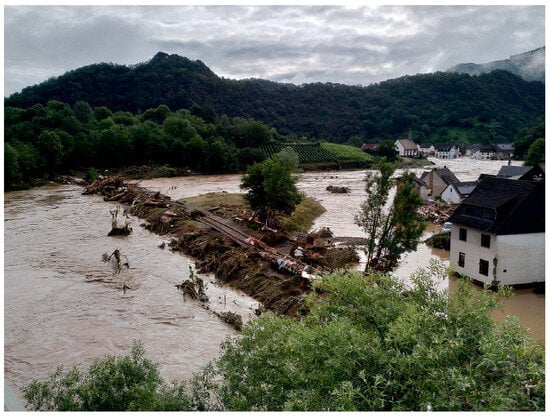 - Flooding in Altenahr Altenburg, Rhineland-Palatinate, Germany. Available online: https://en.wikipedia.org/wiki/2021_European_floods#/media/File:Hochwasser_in_Altenahr_Altenburg.jpg (accessed on 19 October 2025).