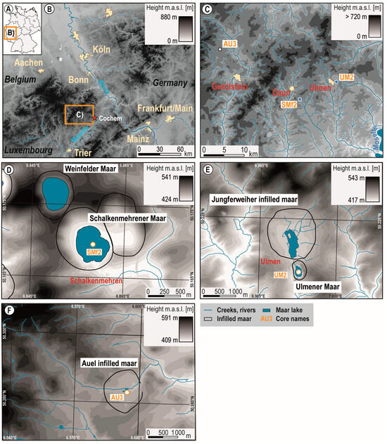 Location of coring sites. (A) Overview of Germany. (B) Digital elevation model (DGM) of West Germany with rivers and streams. Additionally shown is the location of the Moselle water station, Cochem (red star, see Figure 2). (C) DGM of the West Eifel Volcanic Field with drainage system and locations of Schalkenmehrener Maar (SMf2), Ulmener Maar (UM2), and Auel infilled maar (AU3). (D) DGM of the Schalkenmehrener Maar with exact location of core SMf2. (E) DGM of the Ulmener Maar with exact location of core UM2. (F) DGM of the Auel infilled maar with exact location of core AU3.