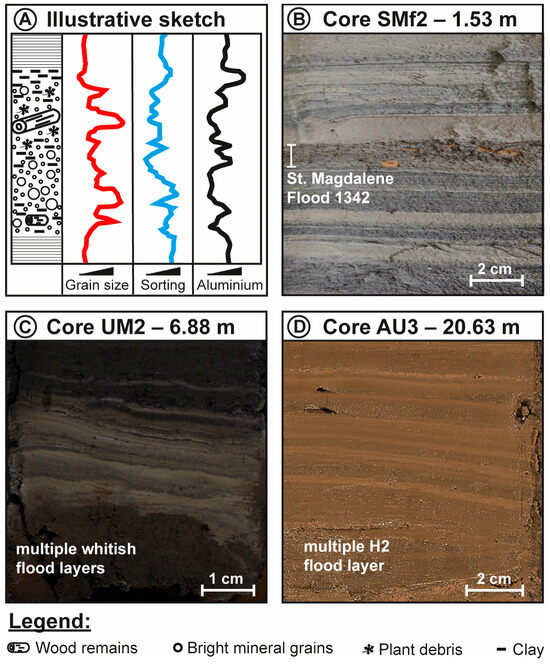 A characteristic feature of flood layers is their distinct sediment texture (Figure 4) and major flood events can even be identified macroscopically on the core (Figure 4B–D). Since the maar lakes vary greatly in their characteristic features such as diameter, basin volume, or inflow rate, differences in flood behavior are also to be expected. For records UM2 and AU3, cores were macroscopically examined and flood deposits thicker than 0.7 cm were visually identified. This allowed a distinction to other event layers caused by, for instance, slope failures. Core SMf2 includes thinner flood layers and was examined microscopically. To compare the flood records, a normalized flood index was calculated (number of flood layers per time interval divided by the maximum number of flood layers per time interval). This method, first established by Brunck et al. [42], yields flood frequency variabilities and does not present an exact count of flood occurrences. Flood records of cores SMf2 and UM2 were first documented by Brunck et al. [42]. AU3 flood data was first published by Albert and Sirocko [40]. Here, we present modified versions based on the ELSA-20 stratigraphy [43] and fine-tuning update of sediment record AU3 [44].