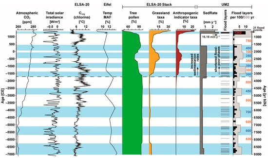 Although riverine systems show a higher sensitivity to paleoweather extremes (Figure 5), they are prone to erosion processes erasing any long-term information [45]. The maar lakes of the Eifel region with their slow and steady sedimentation rates are well suited for documenting extreme events like severe floodings over very long timescales and comparing them with landscape changes and the presence of human activity (Figure 5, Figure 6 and Figure 7). Natural retreat of woodland, or anthropogenic deforestation and land use in a lake’s catchment displace soil-stabilizing vegetation cover and create open landscapes, either through natural steppe formation or agricultural grazing and farmland (e.g., [69,70]). This makes the soil vulnerable to increased water runoff during massive rainfall or snowmelt events, elevating the potential of erosion effects and subsequent flood deposition.