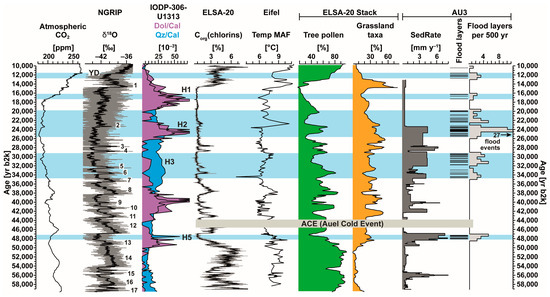 The next occurrence of flood layers in core AU3 can be observed between 17,200 and 16,200 yr b2k, which corresponds to H1. The onset of this flood phase coincides with a prominent initial rise of atmospheric CO2 levels [64], ultimately reaching concentrations characteristic of the Holocene. While tree taxa steadily declined and regional MAF temperatures oscillated between 7 and 8 °C in the preceding millennia, they dropped below 6 °C during the flood phase (Figure 7).