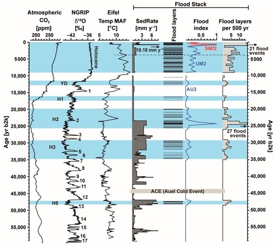 Looking even further back in time, before humans actively changed their environment through intensive land use, it becomes apparent that climate-driven shifts in European hydrological systems and phases of increased flood activity occurred throughout the Late Pleistocene. During Heinrich stadials (H), which are defined by coarse-grained event layers of ice-rafted debris in North Atlantic sediment records [33], an expansion of sea ice and interruption of the Atlantic Meridional Overturing Circulation (AMOC) caused pronounced climate deteriorations in the Northern Hemisphere (e.g., [34,35]), detectable in many terrestrial archives across Europe (e.g., [36,37,38]). Westaway and Bridgland [39] showed that peaks in paleoflow records of several Northwest European rivers coincide with H1 and H2 at around 17 ka and 25 ka, respectively. Intervals of increased and supra-local flood activity matching H1–H6 were also found in Eifel maar lake sediments [40], suggesting a clear hydrodynamic response to increased water supply during Heinrich times.