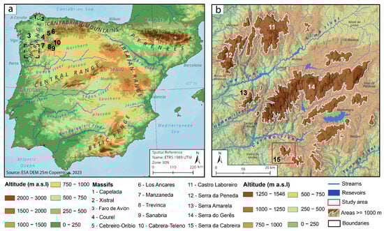 Northwest Iberia inland relief consists of a chain of mid-altitude massifs aligned SW–NE, broadly parallel to the Atlantic coast (Figure 1a). On the Spanish side, the Xistral (1055 m), Los Ancares (1967 m), Cebreiro (1470 m), Courel (1643 m) and Manzaneda (1784 m) massifs separate the Miño basin from the Sil basin [,]. Further east, the Trevinca (2127 m) and the Teleno (2188 m) ranges host the highest summits of the region [] (Figure 1a). South of the border, the Portuguese mountains—Castro Laboreiro (994 m), Serra da Peneda (1416 m), Serra Amarela (1361 m), Serra do Gerês-Xurés (1523 m) and Serra da Cabreira (1262 m)—form a near-coastal orographic barrier that strongly influences atmospheric circulation and moisture delivery [,] (Figure 1b).