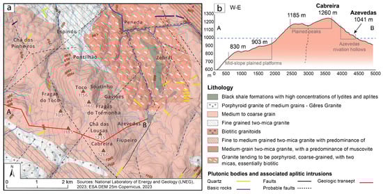 Geological context of Serra da Cabreira: (a) Lithological map of the study area showing the orthogonal fault systems; glaciated areas are predominantly located in medium- to coarse-grained granite; (b) Cross-section profile illustrating the mid-slope planation surfaces and the small highlands between 1100 to 1260 m.
