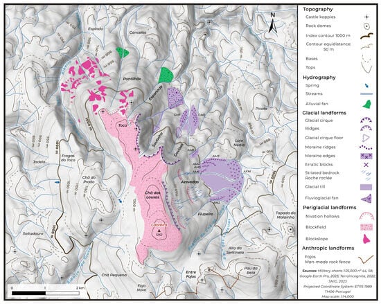 The geomorphological map (Figure 3), produced at a scale of 1:14,000 and covering an area of 21 km2, uses distinct colour schemes for each geomorphological process, enhancing the visibility of morphogenetic contrasts across the landscape. It reveals a well-organised assemblage of glacial, periglacial, fluvial, and structural landforms developed within a granite massif shaped by orthogonal fault systems. Glacial features are concentrated in the Gaviões and Azevedas valleys, where cirques, till patches, moraine complexes, erratic blocks, and striated bedrock define two former valley-glacier systems.