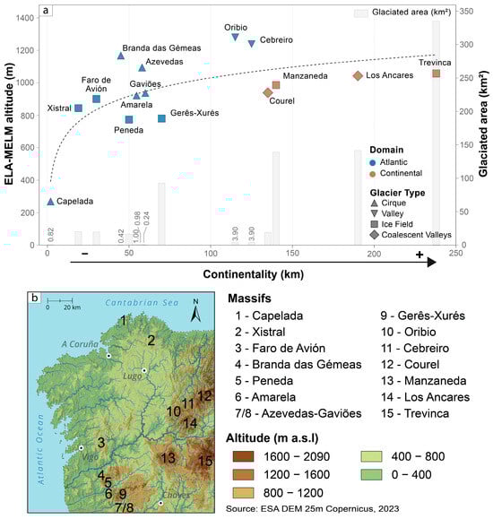 LGC ELA Altitude and Glaciated Area vs. Distance from the Coastline and Glaciers Typology: (a) Plotted values of ELA-MELM and glaciated area per massif, distributed by distance since the coastline in the northwest Iberia classified as glacier type and type of continental effect; (b) Northwest Iberia geographical arrangement of the studied massifs.