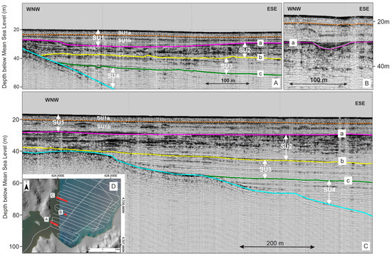 Seismic Unit 2 (SU2) lies below SU1, and is restricted by R-a (at the top) and Reflector b (R-b, lower boundary). SU2 is characterized by continuous and discontinuous, high-amplitude reflectors, locally (near the top) forming a V or U-shaped internal shapes or transitioning to low/medium-amplitude reflectors and small lenses of chaotic acoustic appearance. Internal hyperbolas are observed at several stratigraphic levels, as well as smaller and larger erosional surfaces at the top of this seismic unit. Based on the reflection patterns and following standard seismic stratigraphic principles and interpretations [39,40,41,42], these acoustic returns generally suggest coarser and more compacted sediments, occasionally alternating with some discontinuous layers of relatively finer sediments and locally channelized scours and lensed deposits of mixed material. Towards the central and southern part of the gulf, the SU2 basal reflections (above R-b), appear to be lower in amplitude and parallel, differentiated from the overlying reflections, having a maximum thickness less than 6 m. SU2 can be correlated with older stratigraphic sequences deposited during relative sea-level drops when the gulf was isolated from the open Aegean Sea and terrestrial sedimentation processes prevailed. The irregular morphology of R-a, at the top of SU2, in combination with the shape of the underlying reflectors, gives evidence of the paleo-drainage network of the gulf and of erosional processes prevailing towards the paleo-strait (Figure 3A,B). R-b, at the base of SU2, returns a medium-amplitude reflection of irregular morphology consistent with another distinct unconformity that has a depth range between 17 m and 72 m. Therefore, R-b corresponds to the earliest surface that was exposed during the last regression.