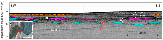 Seismic profile along the strait, showing the reduced thickness (thinning out) of SU1 and the SU2, both overlying the acoustic basement (purple line (a): R-a, cyan line: acoustic basement, orange dotted line: SU1b/SU1a unconformity, red line: fault). Inset map shows the location (red line) of the seismic profile.