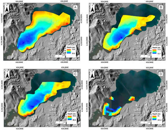 The thickness of SU2 (Figure 6B) closely follows the bathymetry of R-b. Thicker sediments are observed in the eastern part of the gulf’s center within the observed depression of R-b (reaching a maximum thickness of 46 m), while the thinnest sediments are observed in the northern parts and near the strait, where R-a and R-b converge over the acoustic basement. The two terraces identified in the depth map of R-b, are also covered by a thin layer of deposits.