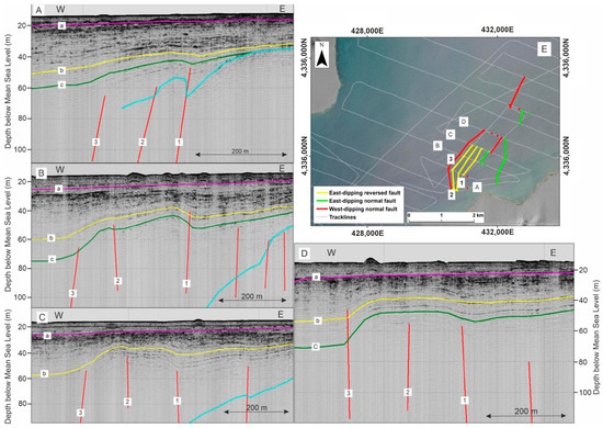 The fault zones in the eastern margin of the gulf (second category), have a general NNE-SSW orientation, they are probably responsible for the uplift of the acoustic basement, the R-b and the R-c, and the formation of the two distinct terraces, as also observed in the key reflector’s depth maps (Figure 5), as well as for the abrupt thinning of SU2 and SU3 in these areas (Figure 6). These zones appear to have a complex structure, consisting of closely spaced faults that define intense deformation zones, or developing simultaneous normal and reverse structures and show changes in dip direction along successive seismic profiles or providing evidence of potential flower structures. The structural characteristics of these fault zones probably indicate a strike-slip component [6,53]. Due to their orientation and location, the fault zones could be correlated with the Aghia Paraskevi strike-slip fault, supporting the submarine extension of the fault in Kalloni Gulf. The absence of relevant evidence of the fault’s extension to the northeast is due to limited survey coverage, operational constraints and progressively reduced seismic penetration of the system towards shallower waters.