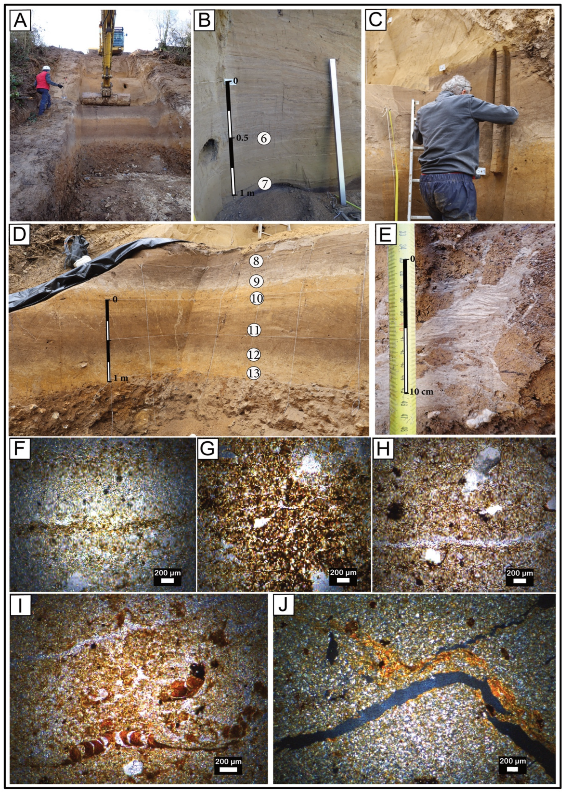 | 7 | Orange silts with thick doublets, cut by silty veins in the upper part, with ferric illuviation features. |