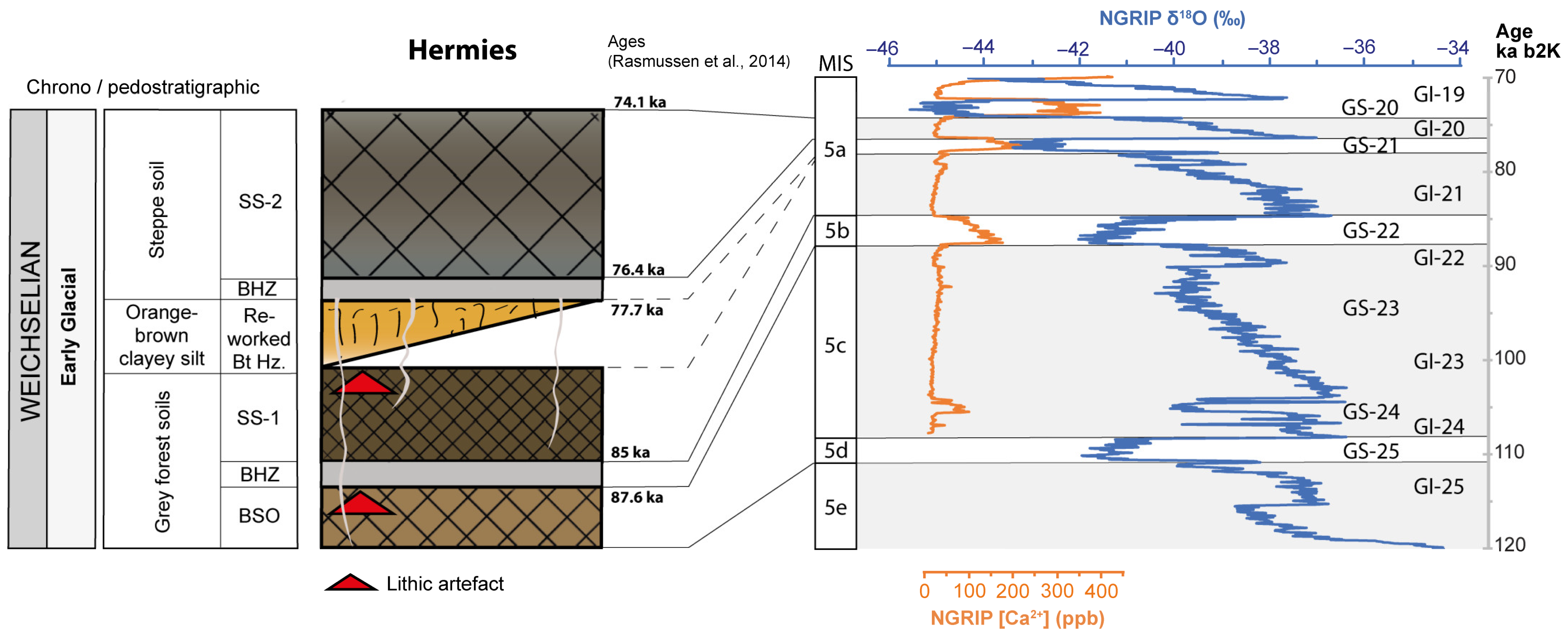 - Locht, J.-L.; Sellier, N.; Antoine, P.; Koehler, H.; Debenham, N. Mauquenchy (Seine-Maritime, France): Mise en évidence de deux niveaux d’occupation paléolithique dans un sol gris forestier daté du SIM 5A (début glaciaire weichselien)/Mauquenchy (Seine-Maritime, France): Evidence of two palaeolithic levels in a MIS 5 grey forest soil (early Weichselian). Quaternaire 2013, 24, 247–257. [Google Scholar] [CrossRef]