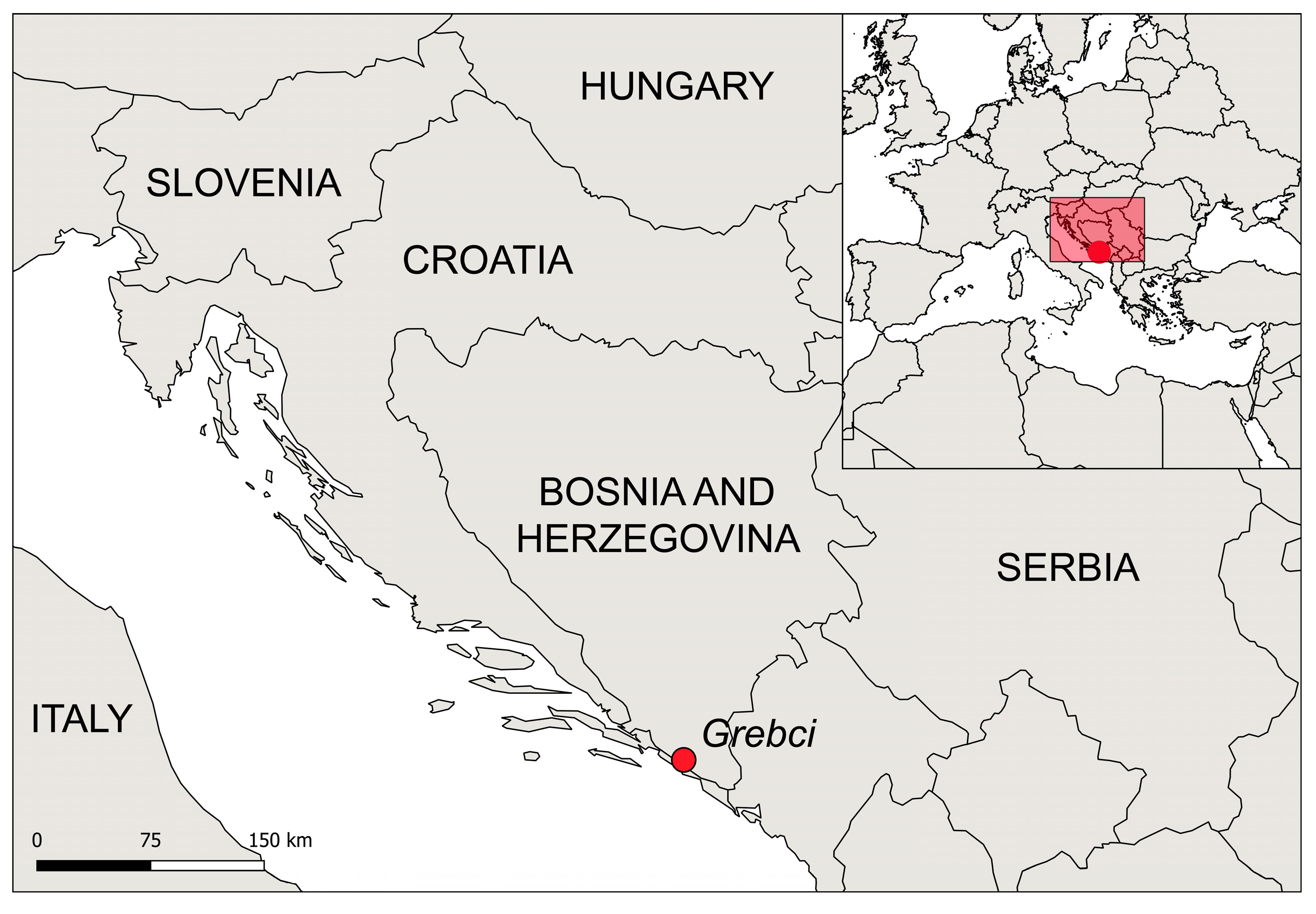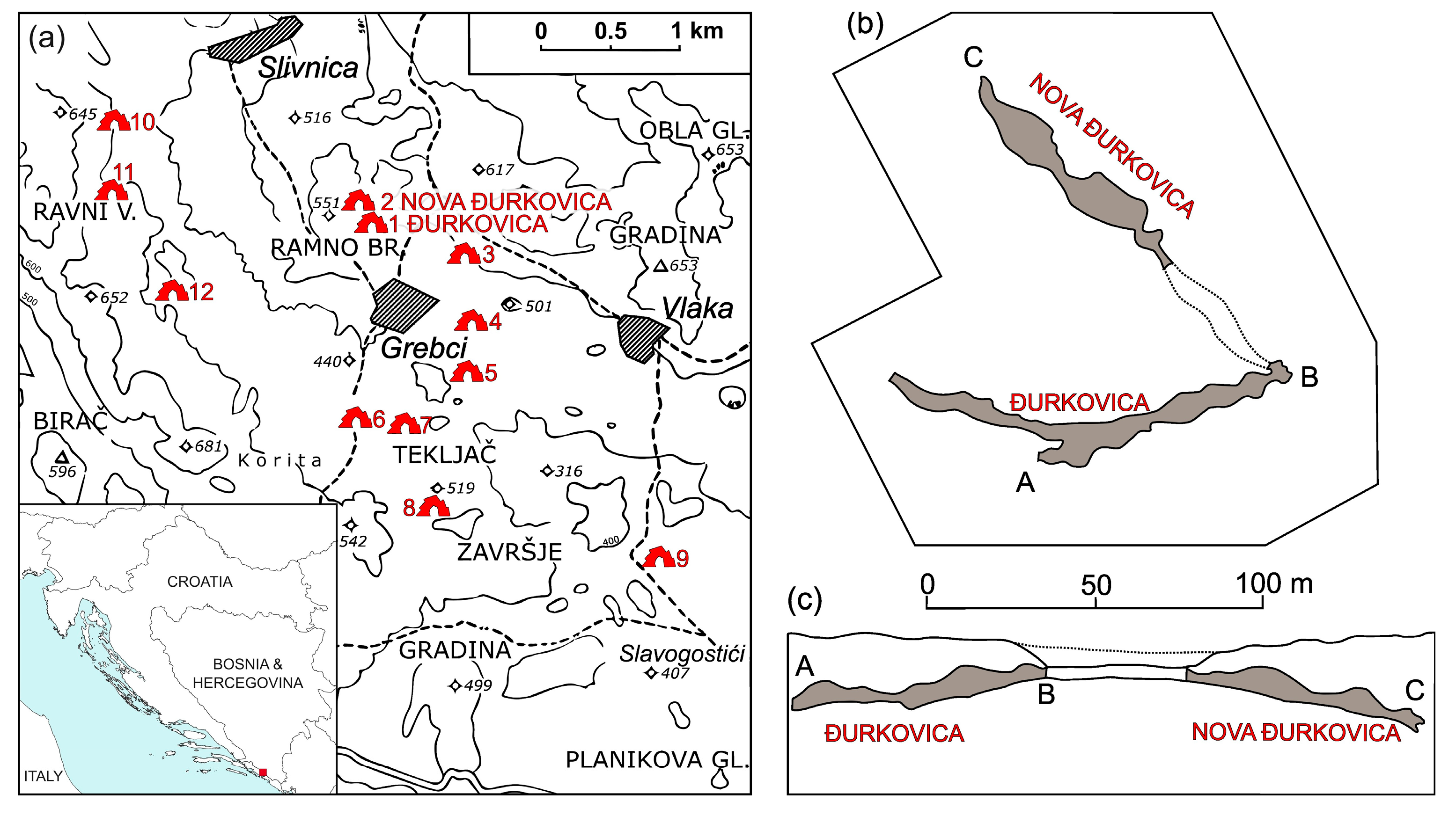 - Mandić, O.; Göhlich, U.B.; Hrvatović, H.; Mauch Lenardić, J.; Čvorović, B.; Glamuzina, G.; Radoš, D. New Proboscidean Site from the High Karst Dinarides in Southern Bosnia and Hercegovina. In Neogene to Quaternary Geological Evolution of Mediterranean, Paratethys and Black Sea: Abstract Book; Istanbul Technical University: Istanbul, Turkey, 2013; p. 189. [Google Scholar]