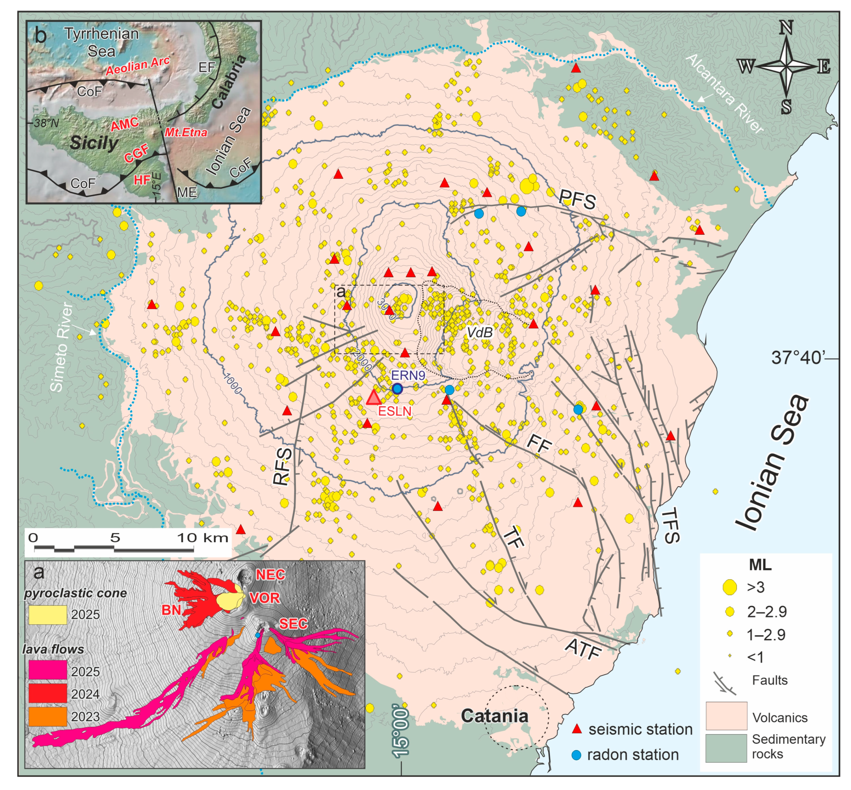 11]. Radon anomalies often reflect shallow rock fracturing, increased pore pressure, or enhanced gas circulation. These phenomena have been linked to magma movement within the volcano, which could result in eruptive activity [