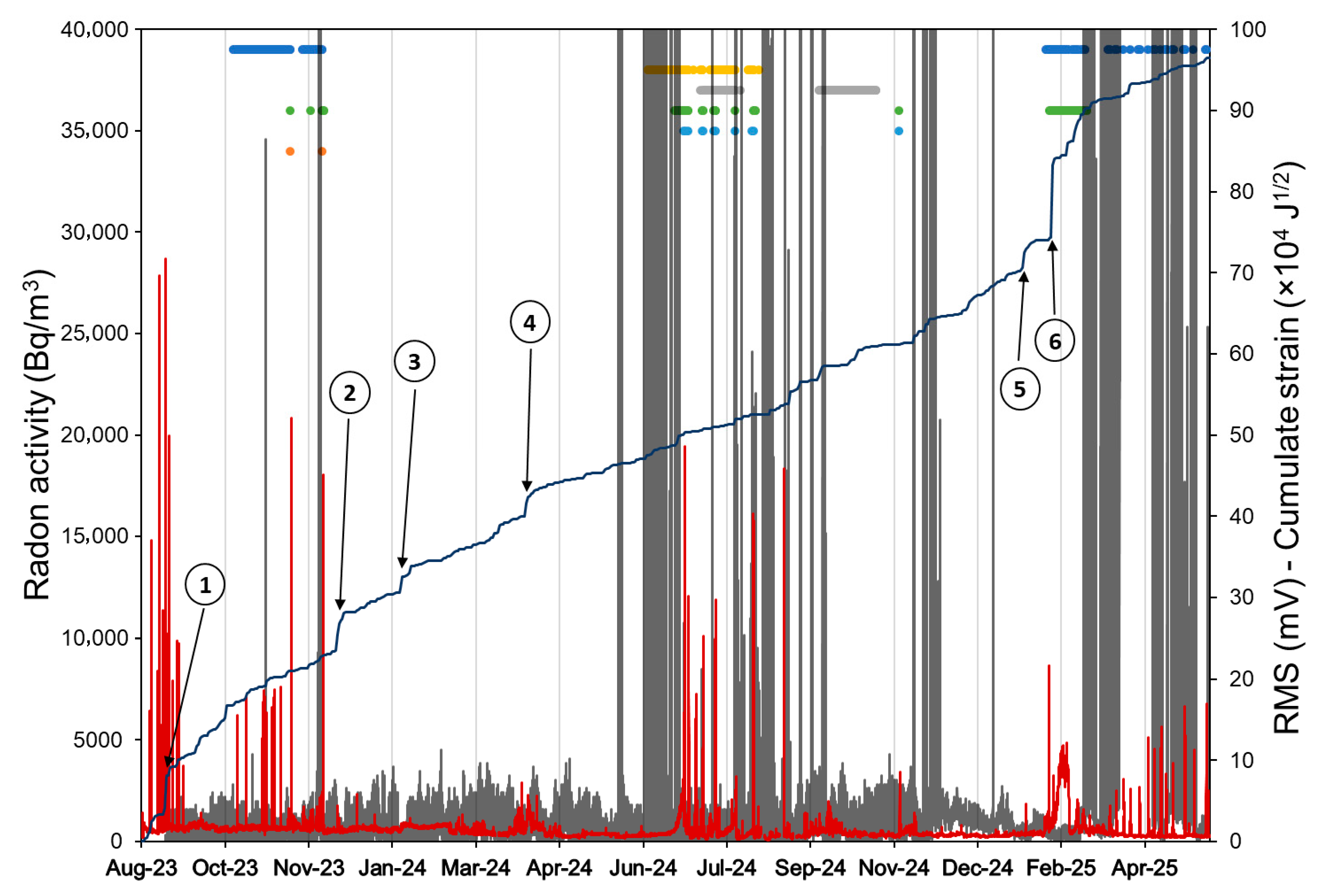 63] have already highlighted radon anomalies linked to rock microfracturing and fluctuations in soil gas pressure due to stronger magmatic degassing. The present work adds a level of robustness to these observations by quantitatively assessing the probabilities of temporal correlation with other monitoring parameters.