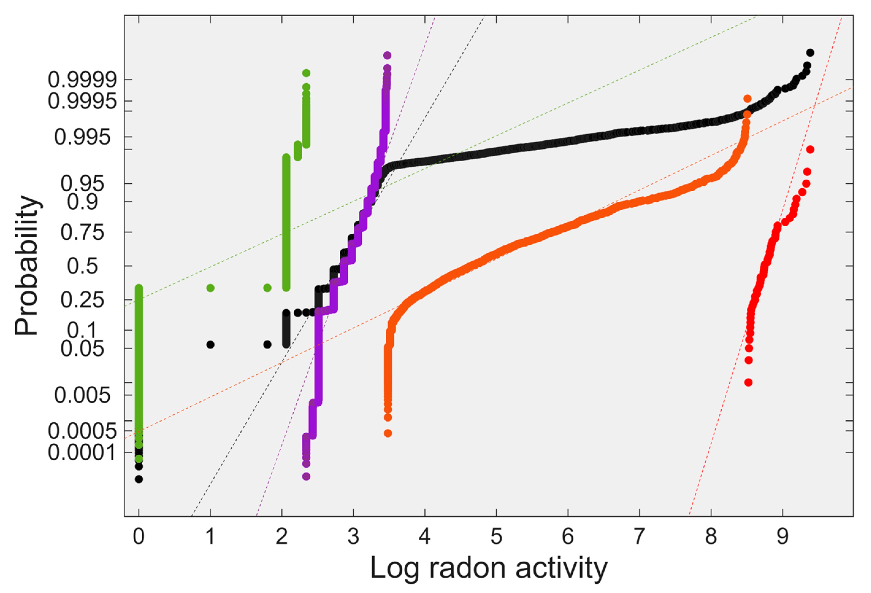 th percentile and two minor ones, at percentiles 17.7 and 99.8, respectively, thus indicating four distinct populations of data. The mean values of radon activity for the four populations are, respectively, 78.5, 911.3, 1.05 × 10