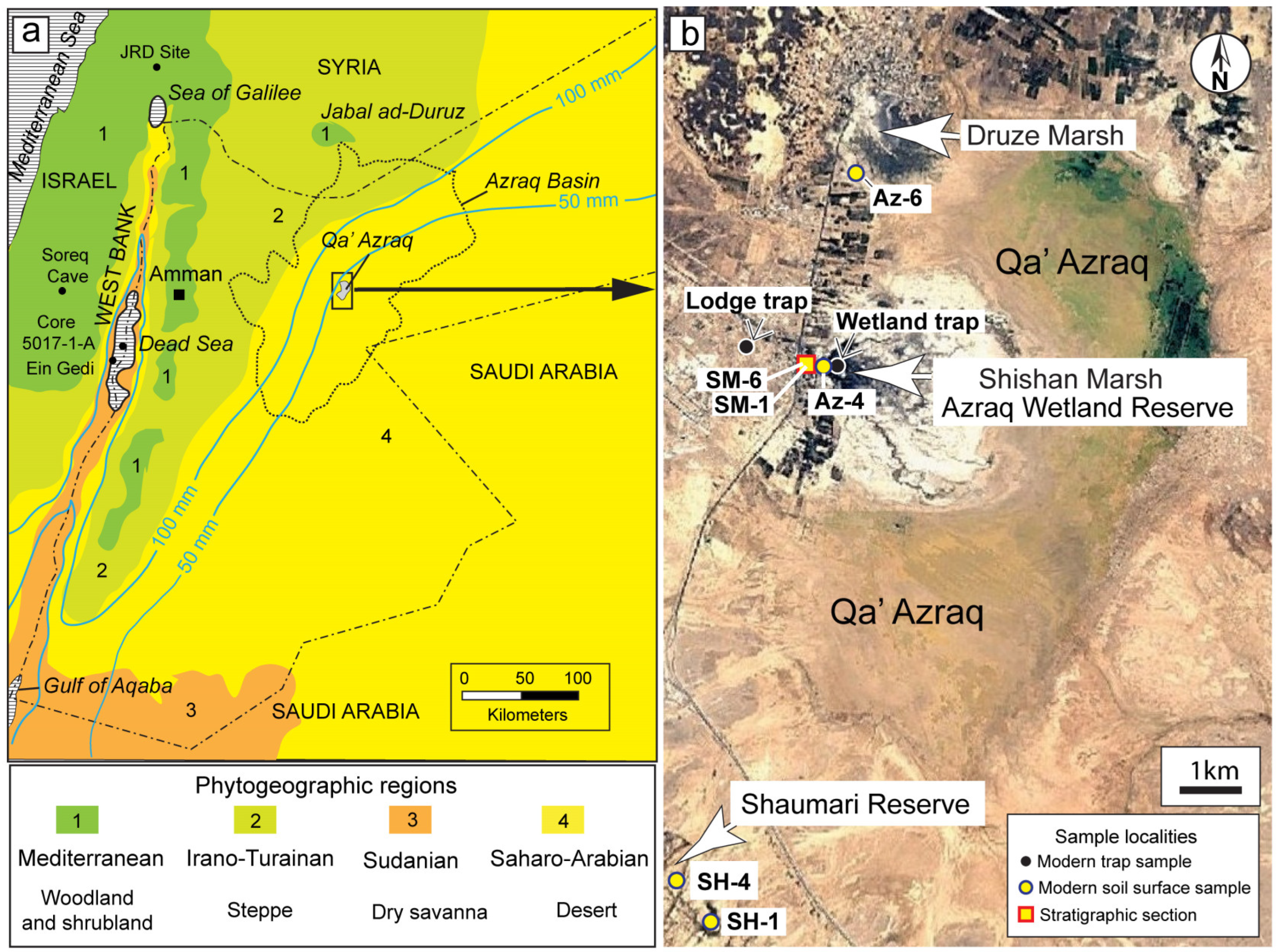 - Boyd, K.C.; Ames, C.J.; Cordova, C.E. The Middle to Late Pleistocene transition in the Azraq Oasis, Jordan: A phytolith-based reconstruction of wetland palaeoecology. Palaeogeogr. Palaeoclimatol. Palaeoecol. 2022, 595, 110967. [Google Scholar] [CrossRef]
