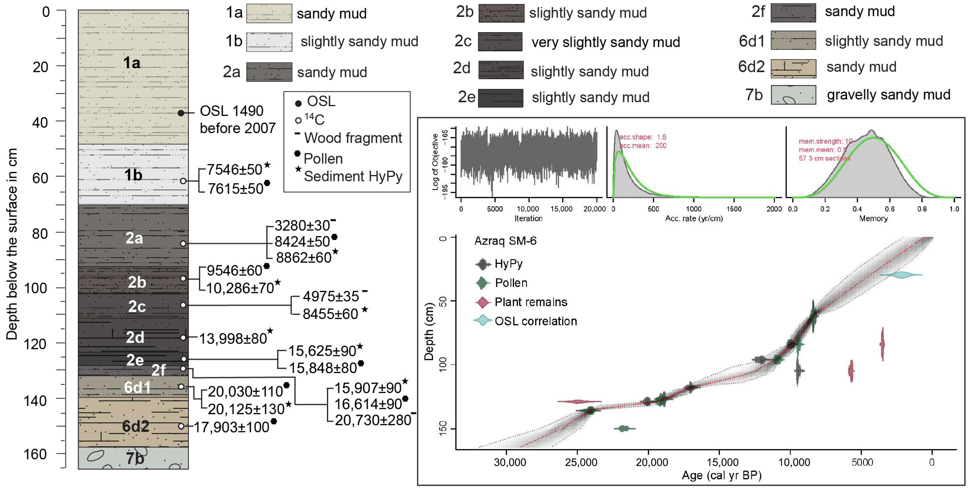 - Ames, C.J.; Cordova, C.E.; Boyd, K.; Schmidt, C.; Degering, D.; Kalbe, J.; Jones, B.G.; Dosseto, A.; Pokines, J.T.; Alsouliman, A.; et al. Middle to Late Quaternary palaeolandscapes of the central Azraq Basin, Jordan: Deciphering discontinuous records of human-environment dynamics at the arid margin of the Levant. Quat. Int. 2022, 635, 31–52. [Google Scholar] [CrossRef]