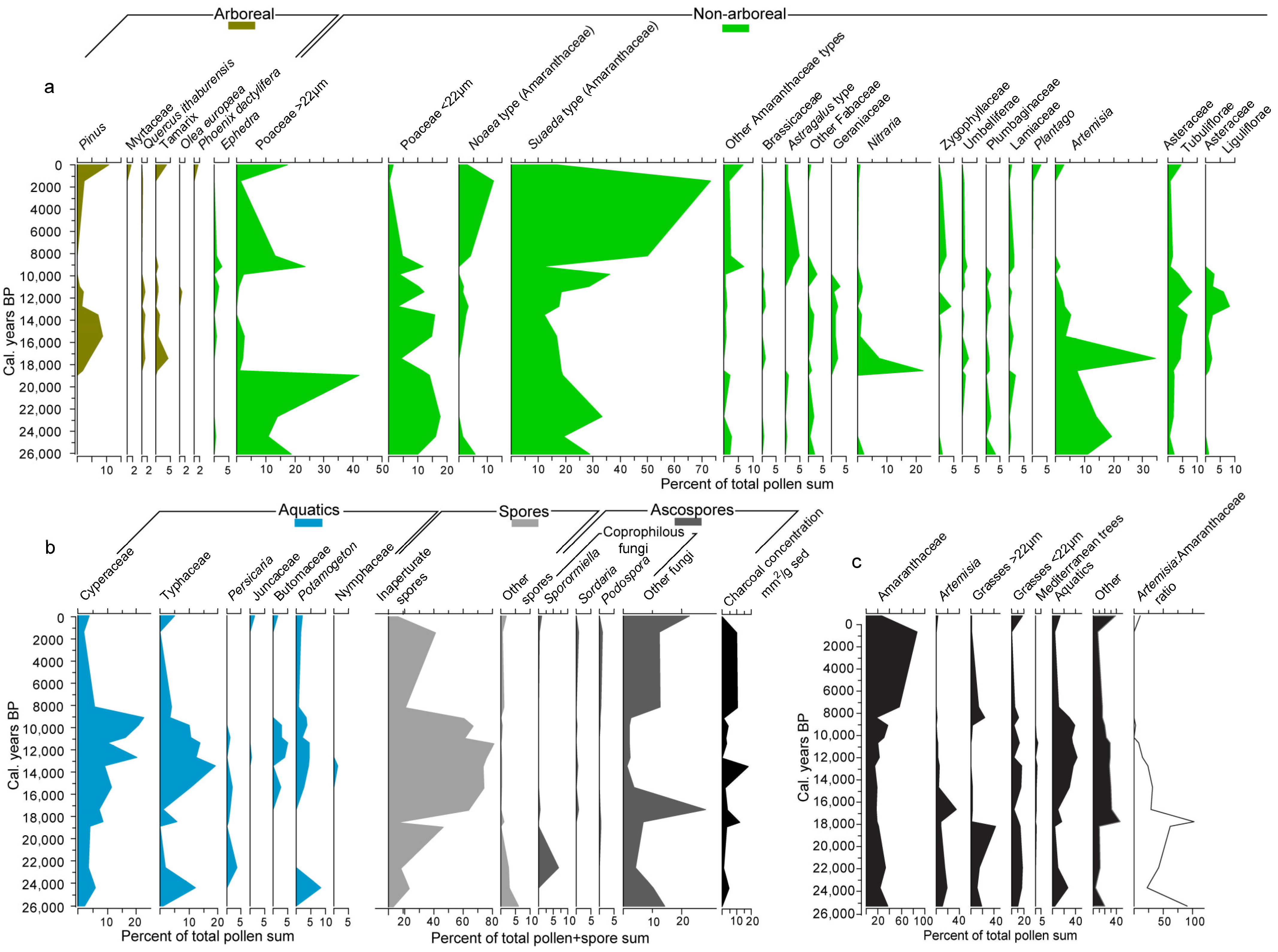 - El-Moslimany, A.P. Ecological significance of common nonarboreal pollen: Examples from drylands of the Middle East. Rev. Palaeobot. Palynol. 1990, 64, 343–350. [Google Scholar] [CrossRef]