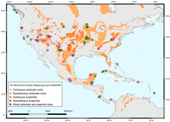 Map showing distribution of carbonate and evaporite rocks in North and Central America provided by the World Karst Aquifer Mapping project (WOKAM [11]). Purple circles indicate speleothem record sites included in SISAL_v1 [1], while green circles indicate speleothem records sites that have been identified, but are not included in SISAL_v1. Specific information about all sites is included in Table 1.