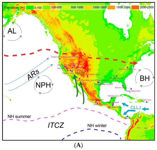 Further inland, δ18Ospel from caves in the Great Basin are interpreted to reflect a combination of changes in temperature and moisture source of winter storm systems that are closely aligned with northern hemisphere summer insolation on orbital timescales [47,48]. In southwestern North America, speleothem records from Arizona and New Mexico are interpreted to reflect the balance of contribution of winter (relatively depleted in 18O) versus summer (relatively enriched in 18O) precipitation, with variations mainly attributed to changing inputs of winter precipitation from the Pacific [5,40]. In central Texas, δ18Ospel variations were interpreted to be closely tied to the δ18O signature of the Gulf of Mexico, which is the primary moisture source region [18].