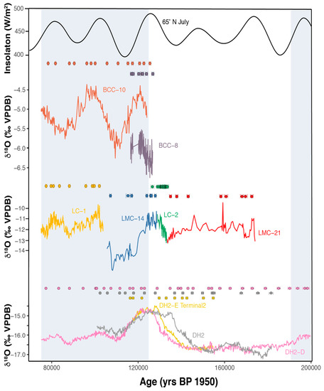 - Shakun, J.D.; Burns, S.J.; Clark, P.U.; Cheng, H.; Edwards, R.L. Milankovitch-paced Termination II in a Nevada speleothem? Geophys. Res. Lett. 2011, 38, L18701. [Google Scholar] [CrossRef]
