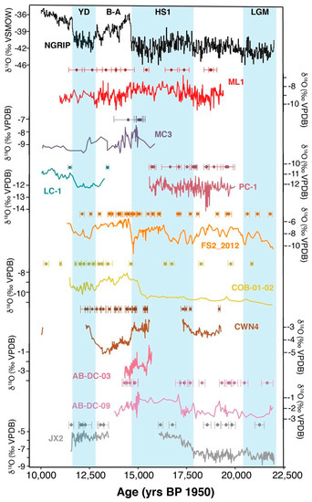 The SISAL_v1 database contains 13 speleothems from North and Central America that cover the interval between 22 and 10 ka. We focus on 10 of these (Figure 6) because the two Devils Hole cores that cover this interval are of lower temporal resolution (Section 4.1.1), and we only use the most recently published (FS2 2012) of the two versions of the Fort Stanton Cave record in the database. Coverage of the LGM and deglacial period in SISAL_v1 is particularly strong in western North America, with records from seven caves covering at least 2000 years of this interval (ML1, MC3, LC-1, PC-1, FS2-2012, COB-01-02, and CWN4) (Figure 6). Three speleothems from two cave sites in the lower latitudes cover this interval, AB-DC-03 and AB-DC-09 from Abaco Island, Bahamas, and JX2 from Juxtlahuaca Cave in Mexico. Visually, these records show important similarities across this interval of significant global climate change. Particularly noticeable are changes at end of Heinrich Stadial 1 (HS1) and the onset of the Bölling warm period at ~14.5 ka (Figure 6). Records FS2-2012, COB-01-02, and MC3 from western North America show shifts to more positive δ18O values within age errors of each other and of this transitional period noted in the NGRIP δ18O record of temperature [115]. Records CWN4 from Texas and the Abaco Island speleothems from the Bahamas show the opposite shift, with δ18Ospel decreasing across this interval. In western North America, records ML1, MC3, LC-1, FS2-2012, and COB-01-02 display shifts to more negative δ18Ospel heading into the Younger Dryas cold period at ~12.8 ka (Figure 6). Likewise, the CWN4 record shows a positive shift leading into this period before a growth hiatus begins at ~12.5 ka.