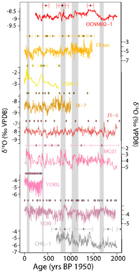 - Medina-Elizalde, M.; Burns, S.J.; Lea, D.W.; Asmerom, Y.; von Gunten, L.; Polyak, V.; Vuille, M.; Karmalkar, A. High resolution stalagmite climate record from the Yucatán Peninsula spanning the Maya terminal classic period. Earth Planet. Sci. Lett. 2010, 298, 255–262. [Google Scholar] [CrossRef]
