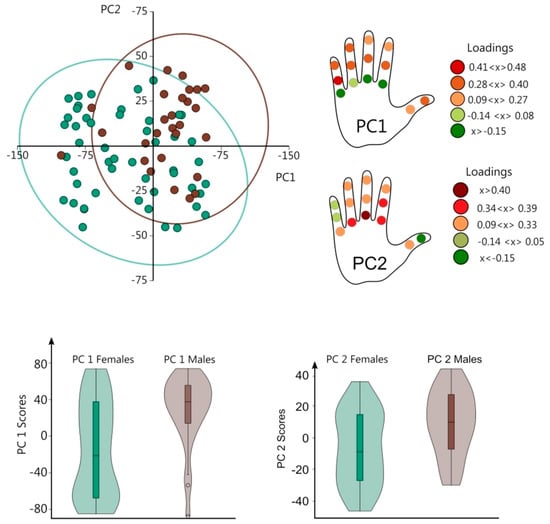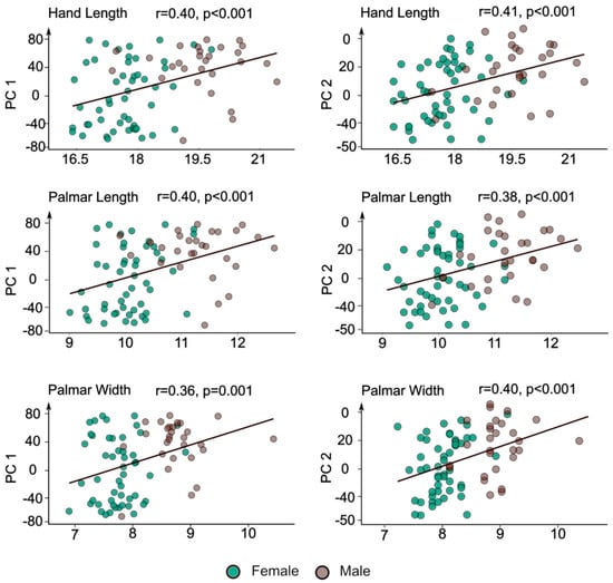 Correlations among PC1, PC2, and hand dimensions were significant for the pooled sample but not when analyzed separately for males and females. Correlations were considered significant for p < 0.017. Hand dimensions significantly correlated with PC1 (HL: r = 0.40, p < 0.001; PL: r = 0.40, p < 0.001; PW: r = 0.36, p = 0.001) and PC2 (HL: r = 0.41, p < 0.001; PL: r = 0.38, p < 0.001; PW: r = 0.40, p < 0.001) (Figure 5). However, when analyzed separately, correlations lost significance (Table 5). Similar results were obtained when PCA was computed separately for males and females.