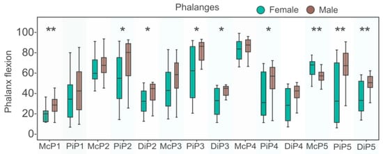 Distribution of the values of degree of phalanx flexion in males and females (median, interquartile, and range). Higher values mean more flexion. Significant differences between males and females are marked with an asterisk.