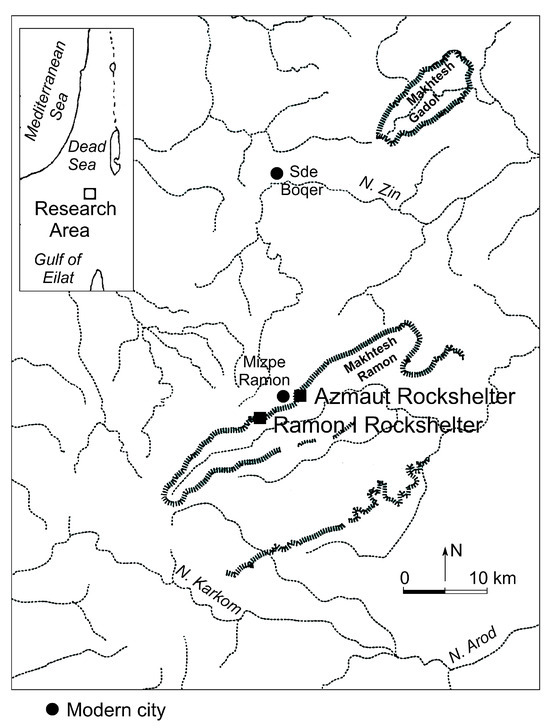 There are a large number of climate reconstructions for Israel. But the main part of the objects is located in the north of Israel due to a small number of possible palaeoinformation sources in the desert. Recent work on dung deposits from central part of the Negev Desert may provide an estimation of water availability directly in this area. The focus of this study is stable isotopes (carbon 13C/12C and nitrogen 15N/14N) analyses of two zoogenic deposits: Atzmaut (N 30°36′27,48″ E 34°48′26,28″ 820 masl) and Ramon I (N 30°35′1,32″ E 34°44′0,36″ 850 masl). They are formed in rock shelters. The deposits are disclosed in central part of the Negev Desert at the top of the northern cliff erosion crater known as Makhtesh Ramon (Figure 1) [39]. The rock shelters are located close to each other (about 5 km) under the same climatic conditions: the average annual precipitation is about 100 mm [40]. The central part of the Negev Desert is covered with sparse vegetation. Artemisia herba-alba (Asteraceae), Zigophyllum dumosum (Zigophyllaceae) and Reaumuria negevensis (Tamaricaceae) are abundant on the slopes, while Anabasis siriaca and Hammada scoparia (Amaranthaceae) dominate in the valleys [41].