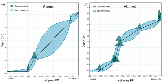 Dung deposits can have rather complex stratigraphy due to the intricate history of their accumulation. Thus, the same cave or niche could at times have been used by ancient shepherds as a shelter for their stock, by wild animals in other periods, as campsites in some periods, and have also undergone periods of abandonment. The deposits would thus consist of alternating layers of different origin, rapidly accrued layers of domestic animals’ dung, less dense deposits that more slowly accumulated from wild animals, and complex deposits from the other uses. To make things even more complicated, shepherds frequently used fire, resulting in the formation of ash layers. Such layers indicate not only the presence of hearths; people often burned or cleared out accumulated dung deposits in order to clean the shelter floor. These events could cause the interruption of sedimentation processes or (and) the formation of thick ash layers [39,64]. Many other circumstances may also affect the accumulation rate of dung deposits and result in their complex stratigraphy and non-uniform growth. That is why the robust absolute chronology of dung deposits can be constructed only with adequate age-depth models.