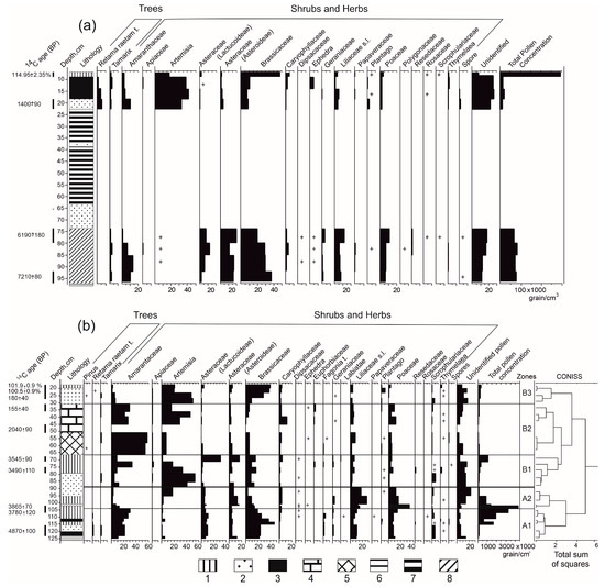 The 13C record and palynological spectra of samples formed over the past 3000 years are characterized by a high δ13C value and a low total pollen concentration, which is indicative of more stable climatic conditions. The climate of the region became arid, similar to the present-day climate [52,83,87]. Changes in humidity during the last 3000 years have been less significant than in previous periods [52,54].