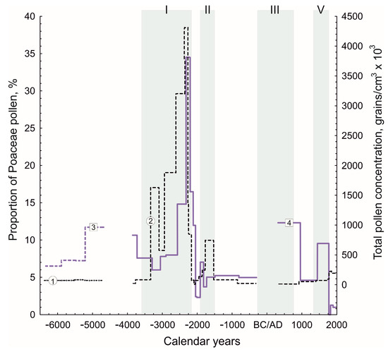 A sharp increase in the δ13C value, a decrease in the total pollen concentration and the proportion of the Poaceae pollen (Figure 5 and Figure 6) at about 2200–1900 cal yr BC indicate climate aridization, which is confirmed by palaeoclimatic data: the amount of precipitation in the region decreased in this period by 20–30% [52,54]. These climatic changes were not local but occurred in many regions of the Mediterranean, Asia and Africa [84,85]. A sharp decrease in precipitation entailed significant changes in the plant cover.