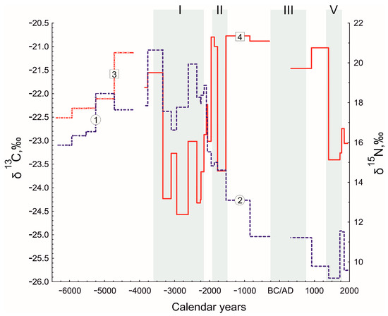 When comparing δ13C and δ15N records with the dynamics of the climate in Israel, it is necessary to consider the published palaeoclimatic data. The sources of palaeoinformation are a wide range of natural objects: the sediments of the Mediterranean, the Red Sea, the Dead Sea and the Sea of Galilee [42,43,44,45,46,47,48,49,50,51,52], palaeosoils [53], speleothems [54,55,56], land snail shells [57], corals [58], cave deposits [59], wood, which is preserved in the archaeological sites and caves [60,61] and the rings of juniperus [62]. According to this literature, the climate in Israel was not stable. Four main humid periods (I—the middle of the 4th millennium–the end of the 3rd millennium BC, II—the 1st half of the 2nd millennium BC, III—the 2nd half of the 1st millennium BC–the 1st half of the 1st millennium AD and IV—the middle of the 2nd millennium AD) and some driest events can be distinguished on the basis of palaeoclimatic data over the past 8500 years (at about 6200, 5700, 2200–1900, 1500, 200 cal yr BC and 500 and 800 cal yr AD and nowdays).